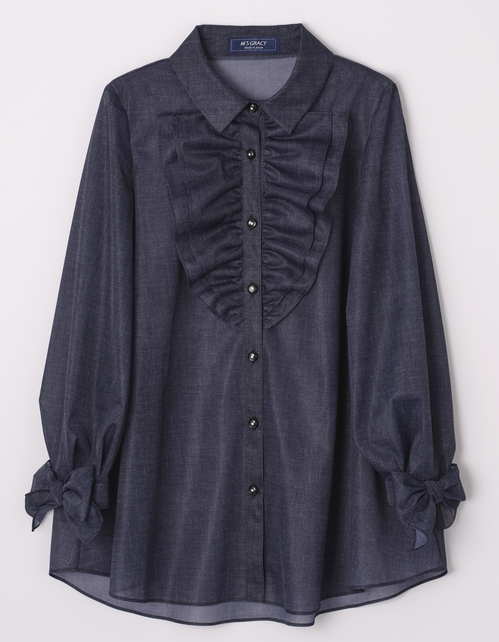 デニム風のシアーブラウスは、シャツ襟にフリルが甘x辛のミックスデザインです。1枚で羽織り風にも使えます。