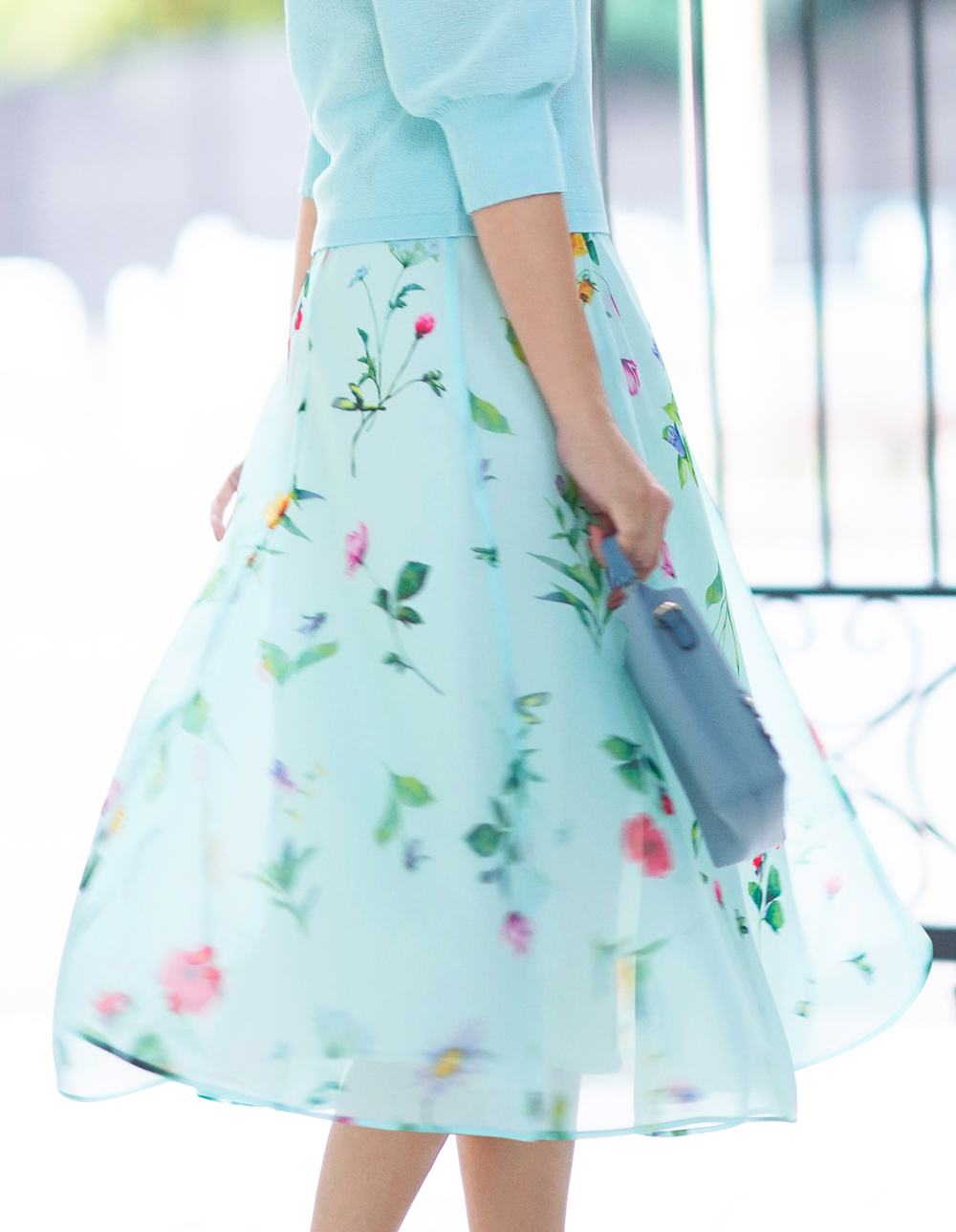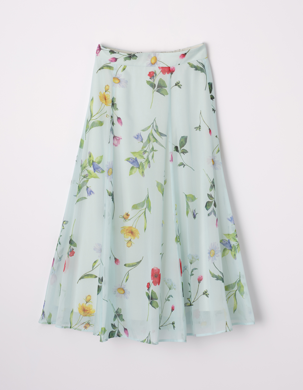 透け感がきれいなボタニカルプリントのスカート。動くたびに軽く揺れるラインがフェミニン。