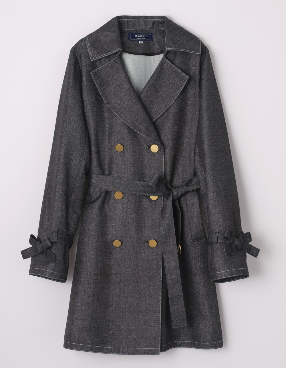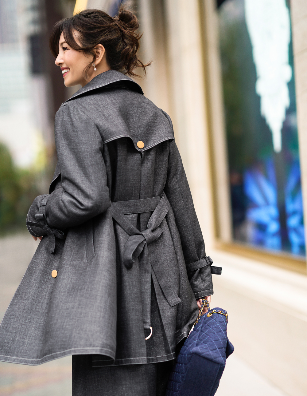 きれい目デニムに控えめなラメの光沢が映えるトレンチ風コート。ロゴの金ボタンとベルトがアクセントに。