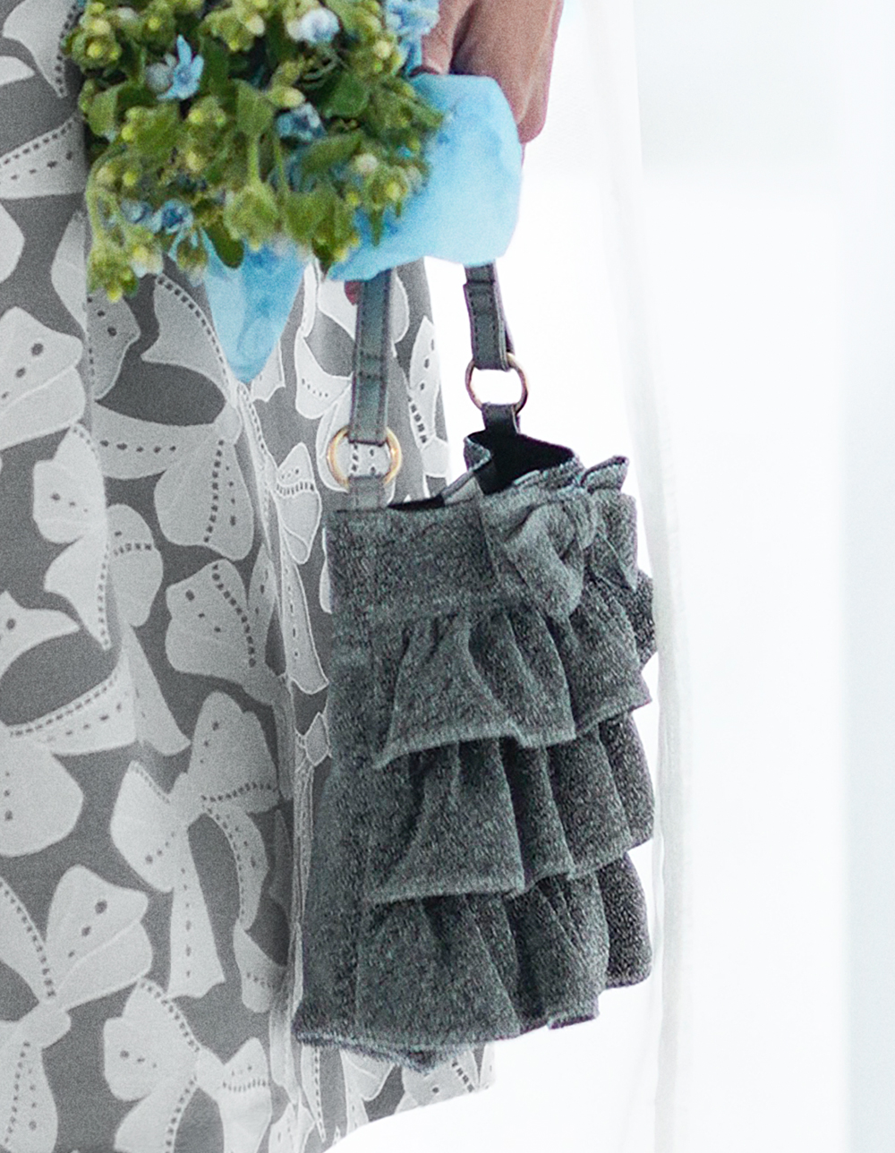 ラメ混の華やかなフリルバッグ。デイリーからお出かけまで幅広く使えそう。合皮のショルダー付きです。