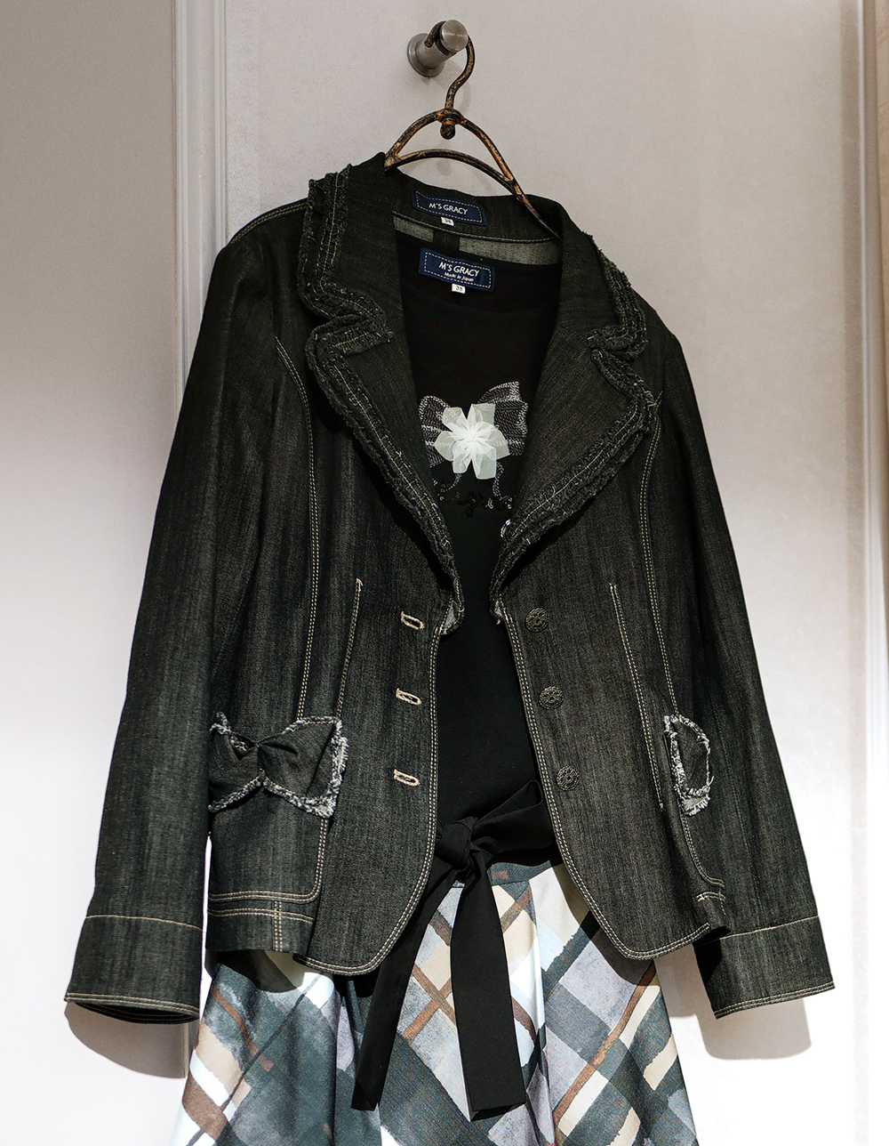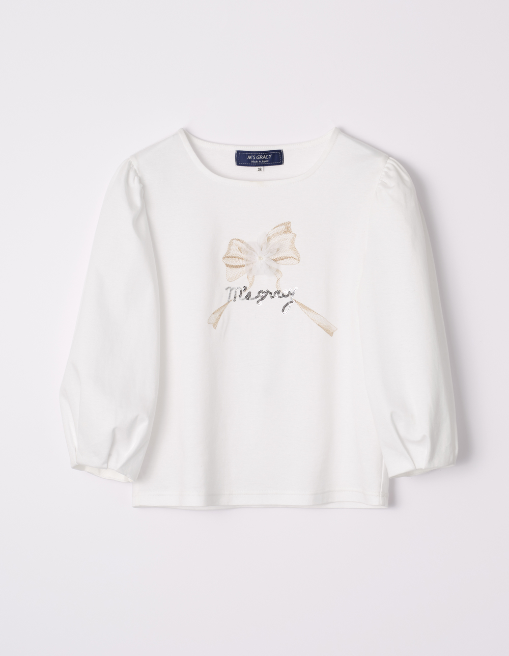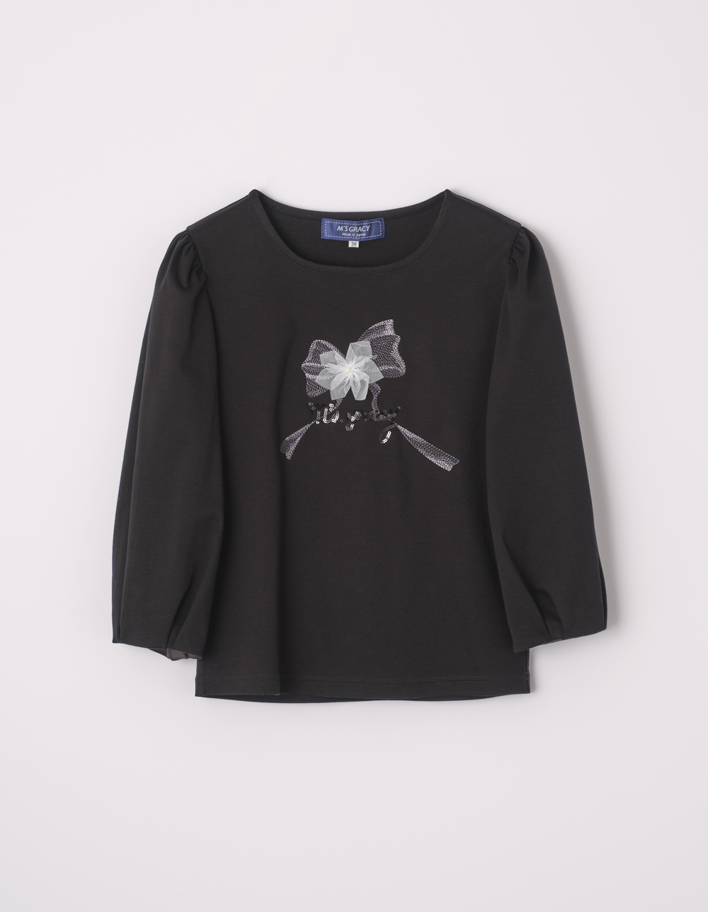 リボンとお花を刺しゅうしたカットソー。程よいふっくらとした七分袖で、1枚でも様になるアイテムです。